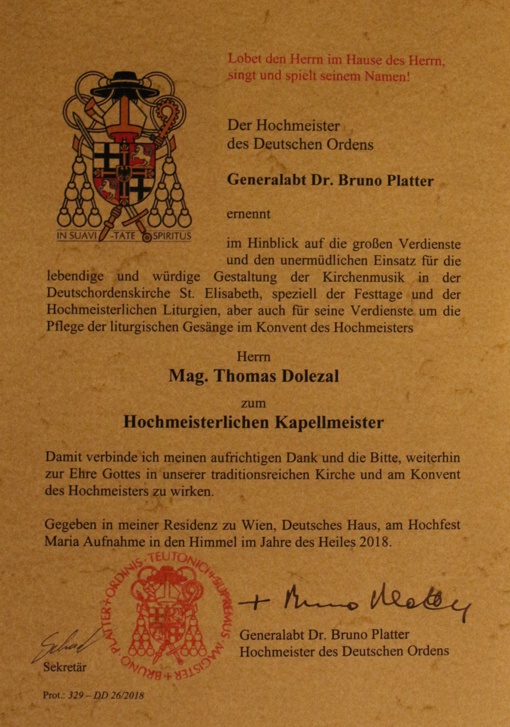 Am Rande des Generalkapitels des Deutschen Ordens hat Hochmeister Generalabt Dr. Bruno Platter OT im Hinblick auf die großen Verdienste und den unermüdlichen Einsatz für die lebendige sowie würdige Gestaltung der Kirchenmusik in der Deutschordenskirche St. Elisabeth speziell der Festtagen und der Hochmeisterlichen Liturgie zum Hochmeisterlichen Kapellmeister ernannt. Seit Jahren wirkt der neu ernannte Hochmeisterliche Kapellmeister im Konvent des Hochmeisteramts, so natürlich auch bei der Liturgie des Generalkapitels.