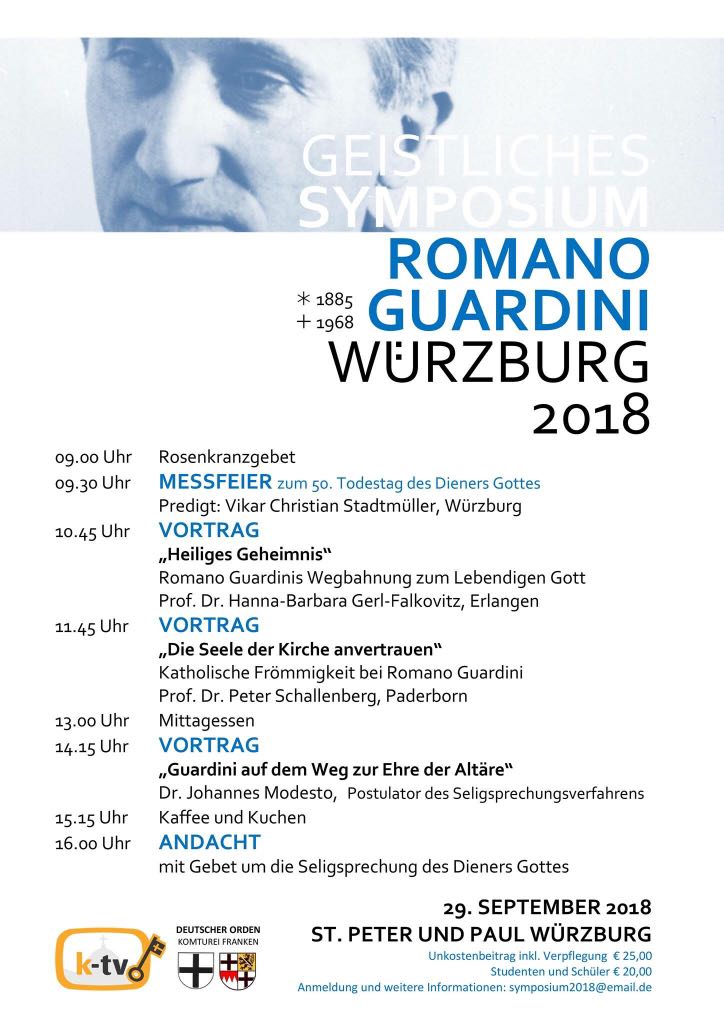 Professor Peter Schallenberg von der theologischen Fakultät Paderborn wird einen Vortrag über die „Katholische Frömmigkeit bei Romano Guardini“ halten. Die Tatsache, dass Guardini nicht nur eine Gestalt der Wissenschaft ist, sondern sein Leben und Wirken auch für die katholischen Christen unserer Zeit wegweisend sein kann, zeigt der Abschlussvortrag des Symposiums, den Dr. Johannes Modesto, der Postulator des Seligsprechungsverfahrens bestreiten wird: „Guardini auf dem Weg zur Ehre der Altäre.“