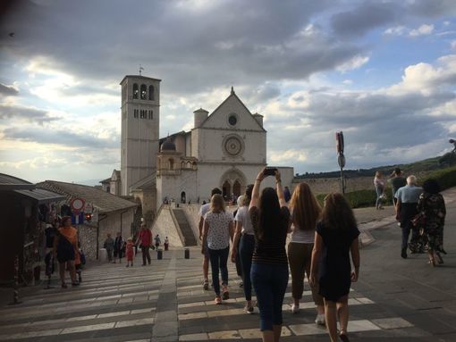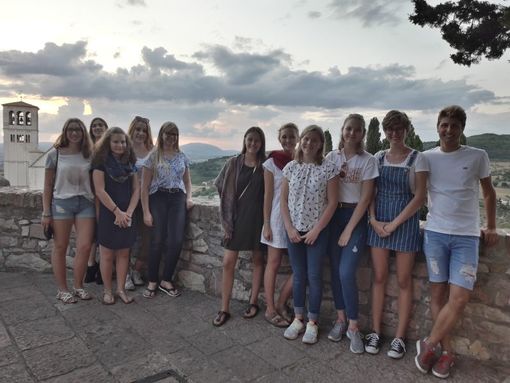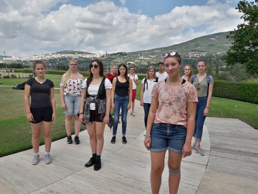 10 Schülerinnen aus der künftigen Q 11 des Gymnasiums Niederalteich verbringen mit Sr. M. Gratia eine Ferienwoche auf den Spuren des hl. Franziskus und der hl. Klara in Assisi. In der Nacht von Samstag, den 1. September 2018, auf Sonntag brachen die Mädchen mit dem Flixbus von München, Sr. Gratia und Johannes Wildfeuer, ein ehemaliger Niederalteicher Schüler, der die Gruppe als Betreuer und Fahrer begleitet, mit dem Pkw nach Umbrien auf. Hier wohnt die Gruppe mitten in der Stadt in einer Ferienwohnung, in der sie sich selbst versorgt. Müde, aber vergnügt trafen am Mittag alle ein und genossen gleich den Blick von der Dachterrasse auf die Dächer, Kirchtürme und -kuppeln der malerischen Altstadt.
