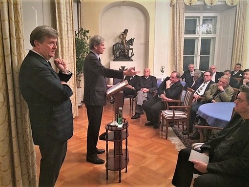 Das Interesse am bekannt pointiert formulierten Vortrag von Professor Matthias Beck war groß – mit Gästen der beiden ritterlichen Gemeinschaften wurden mehr als 80 Teilnehmer gezählt. Ohne Längen, auch für Laien thematisch verständlich aufgebaut sprach sich der studierte Pharmazeut, Mediziner und Theologe für eine neue Kompetenz der Christen aus. Einfach heruntergebrochen: Ich kann nur dann andere von meinem Glauben überzeugen, wenn ich weiß, worüber ich spreche.