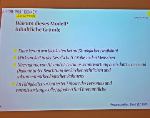Die Entwicklung einer zeitgemäßen Struktur betrifft eines der 8 Themenfelder, welche beim Zukunftsweg bearbeitet werden. Das präsentierte Modell wurde aus zwei Vorschlägen ausgewählt. Es verspricht die notwendige Flexibilität, um adäquat auf die gesellschaftlichen Herausforderungen eingehen zu können, und schafft innerhalb eines klaren Rahmens neue Handlungsfreiräume für die Seelsorge. Hierzu zählt die differenzierte Übernahme von (Leitungs-) verantwortung durch Priester, Diakone und haupt- sowie ehrenamtliche Laien gemäß den jeweiligen Charismen und Begabungen. Außerdem entspricht das Modell dem vielfach geäußerten Wunsch, dass Kirche nahe bei den Menschen bleibt.