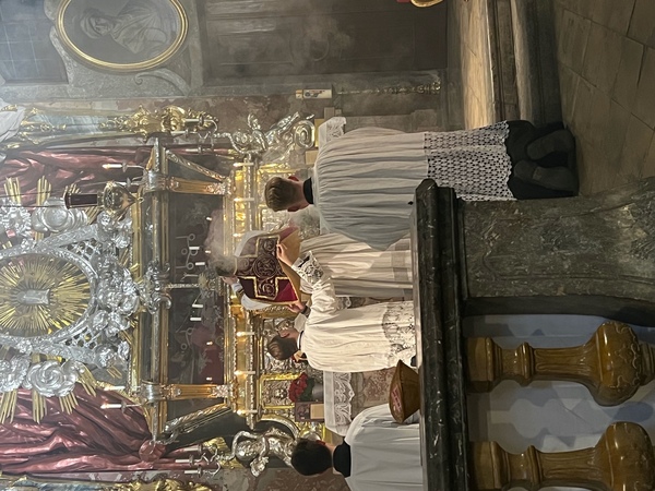Die barocke Asamkirche in der Sendlinger Straße, ein barockes Juwel und eine der schönsten Kirchen Münchens bot den rechten Ort für die geistliche Einstimmung, in den Herr Dr. Markus Christopher Müller (Ludwig-Maximilian-Universität München) zu Beginn kurz einführte. P. Dr. Georg Fischer OT, in Frankfurt unter anderem durch SE Bischöf Bätzing mit der Pflege des usus antiquior des römischen Ritus betraut, feierte ein gesungenes Amt zum Gedenktag des Hl. Apostels Paulus. In seiner Predigt ging er darauf ein, daß Gott einen jeden von uns Familiaren eigens beruft und daß diese Berufung stets Dienst an den Menschen ist, nicht Schmuck oder Belohnung, auf der man sich ausruhen könnte. So wie die Bürger vor Akkon und später die Ritter des Deutschen Ordens ihr Kreuz täglich selbstlos auf sich nahmen, um den Menschen zu helfen, so besteht derselbe Auftrag im Grunde bis heute fort. Die Feier im usus antiquior, der in seiner Zeitlosigkeit seit über 1500 Jahren im wesentlichen unverändert blieb, kann auf diese Weise eine ständige Brücke schlagen und „Gleichzeitigkeit“ zu den Ursprüngen des Deutschen Ordens 1190 vor Akkon herstellen. Die Festlichkeit des Ortes, der Liturgie, des Orgelspiels (W. Eisen) und des Gesangs der Sängerinnen (E. Müller, R. Nikoleiski, M. Steinschulte) führten alle über zwanzig mitfeiernde Familiaren und Gäste dem himmlischen Jerusalem näher.