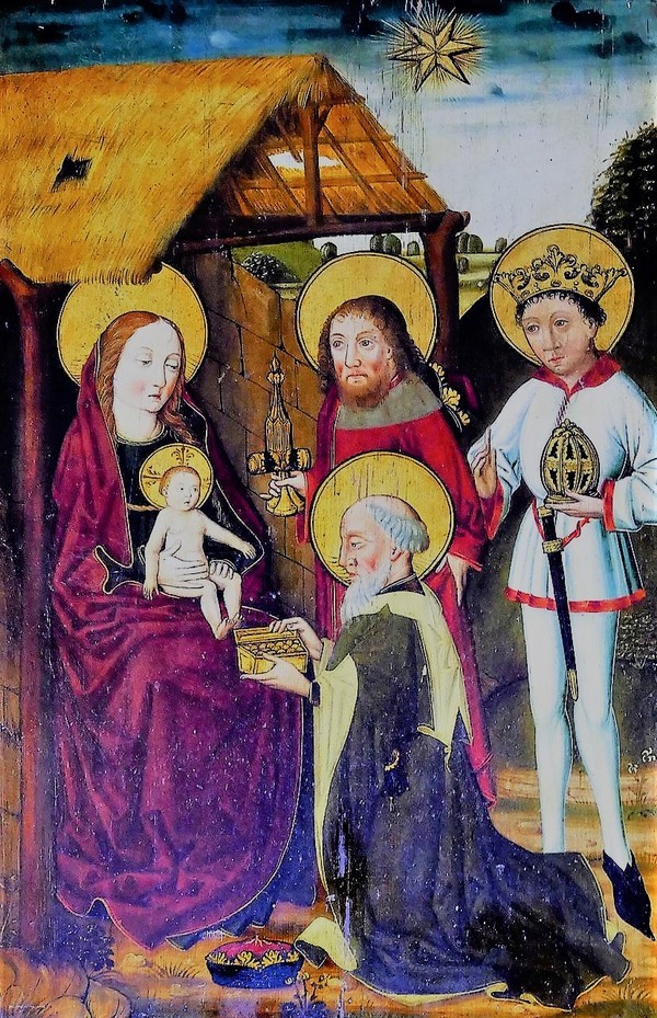 Gemälde: Anbetung der Weisen. Deutschordenskirche in Frankfurt-Sachsenhausen. Ausschnitt aus dem rechten Flügel des Hochaltars. Spätgotisch (aus der Münzenbergischen Sammlung).