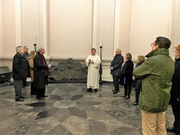Im Anschluss an die Eucharistiefeier wurde das an der Kirche angrenzende Mausoleum, die Grablege des Hauses Pfalz-Neuburg, besichtigt. Hier bedankte sich Komtur Prof. Dr. Norbert Jacobs bei Pater Elias für die würdige Feier der heiligen Messe und die aufbauenden Worte der Predigt. Herzlich begrüßte der Komtur die anwesenden Consorores und Confratres und deren Angehörigen und übergab das Wort an Pater Elias. Der Dominikaner wies auf die enge Verbindung des Fürstenhauses Pfalz-Neuburg zum Deutschen Orden hin. Der Erbauer der Kirche, Herzog Wolfgang Wilhelm (1578 – 1653), war der Großvater zweier Hochmeister.