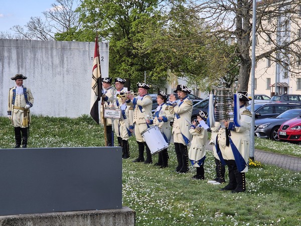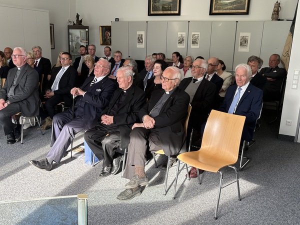 Zu diesem waren zahlreiche Ehrengäste erschienen, allen voran Hochmeister Frank, der eigens aus Wien anreiste, sowie dessen Vorgänger im Amt, Althochmeister Dr. Bruno Platter aus Südtirol. Auch der Prior der Deutschen Brüderprovinz, P. Christoph Kehr ließ es sich nicht nehmen, eigens zu diesem Anlass nach Würzburg zu kommen. Weitere Weggefährten und Freunde aus der Universität, dem Deutschen Orden oder auch dem privaten Umfeld, darunter Bischof em. Dr. Friedhelm Hofmann, Ehrenritter Professor Dr. Dr. h. c. mult. Udo Arnold, Professor Dr. Franz-Ludwig Knemeyer oder Hans-Georg von Mallinckrodt mit Gemahlin kamen an die Forschungsstelle. Den Auftakt des Festaktes bildete dabei der Deutschmeister Spielmannszug der Historischen Deutschorden Compagnie Bad Mergentheim, der einmal mehr seinen musikalischen Ambitionen Ausdruck verlieh und mittels mehrerer Salutschüsse dem Gefeierten die Ehre erwies.