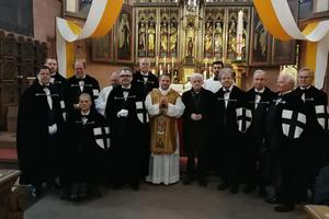 Vergangenen Sonntag begingen die Familiaren der Komturei „An Rhein und Main“ das Ordensfest des Heiligen Georg mit einer feierlichen Messe in der Deutschordenskirche in Frankfurt-Sachsenhausen. Pater Jörg Weinbach OT konnte in seiner Predigt über das Tagesevangelium, der Geschichte des „ungläubigen“ Thomas, einige Szenen des um 1520 entstandenen Georgsfrieses auf der nördlichen Chorwand der Kirche aufgreifen, welche die Glaubenstärke des Ordenspatrons bildlich darstellen.