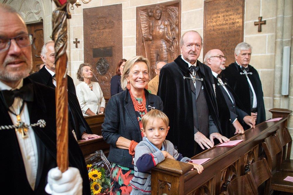 Zum Ende des Gottesdienstes kam es zu einer weiteren Danksagung: der HH Hochmeister verlieh Frau Dr. Gabriele Müller das Verdienstkreuz des Deutschen Ordens. Gabi Müller ist nicht nur für die Familiarenballei eine wertvolle Stütze in allen Fragen der Organisation. Sie steht mit ihrer ärztlichen Expertise außerdem der gesamten Hausgemeinschaft unentwegt zur Verfügung. Heute konnte ihr zum Glück Enkelsohn Berti helfen: Er trug das große Blumenbukett.