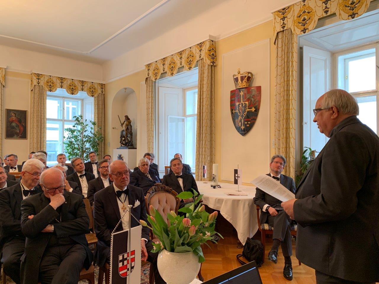 Im Rahmen der Begrüßung wurden insbesondere AHM P.  Bruno Platter und der neugewählte Prior der Brüderprovinz Österreich, P. Karl Seethaler, herzlich willkommen geheißen. Von HM P. Frank Bayard konnte der Balleimeister herzliche Grüße an alle Anwesenden übermitteln, er befand sich auf einer schon im Vorjahr zugesagten Reise mit der Pfarre Gumpoldskirchen in Franken.