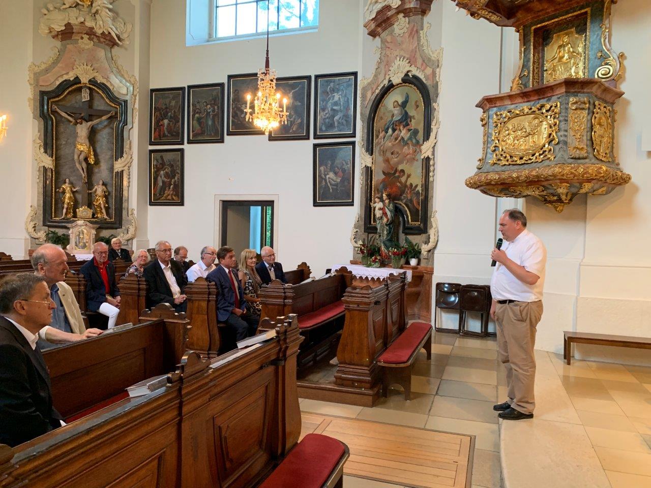 Schon im Mittelalter bestand neben der Kirche ein befestigter Ansitz. In weiterer Folge erwarb Herzog Rudolf IV Schloss und Herrschaft und schenkte sie 1365 der vom ihm gegründeten Dompropstei St. Stephan, aus der später die Erzdiözese Wien wurde. Die prächtige, stilreine heutige Barockkirche wurde in die spätmittelalterliche Wehranlage hineingestellt und 1742-45 errichtet. Weiters berichtete Cfr. Kaiser über das sehr aktive Pfarrleben. Das Konveniat fand in unmittelbarere Nachbarschaft der Kirche einen sehr gemütlichen Ausklang beim Heurigen Schneider-Gössl.