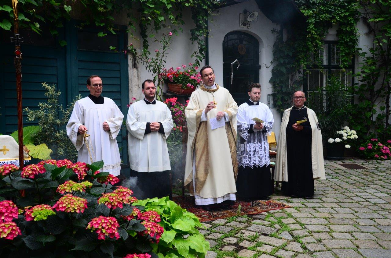 In Wien wurde heuer Covid-19 bedingt im Dom zu St. Stephan ein Fronleichnamsgottesdienst mit stark limitierter Teilnehmerzahl abgehalten, den S. Em. Christoph Kardinal Schönborn leitete, der übliche Stadtumgang wurde abgesagt. Hochmeister P. Frank Bayard zelebrierte ein Pontifikalamt zum Hochfest des Leibes und Blutes Christi im Innenhof des Deutschen Hauses, nach Gestaltung von Florian Weber, dem pers. Referenten des Hochmeisters und der gemeinsamen Vorbereitung mit Fr. Ingenuin Unerhofer. Für die musikalische Gestaltung zeichnete der Hochmeisterliche Kapellmeister Mag. Thomas Dolezal mit einem Bläserensemble verantwortlich.