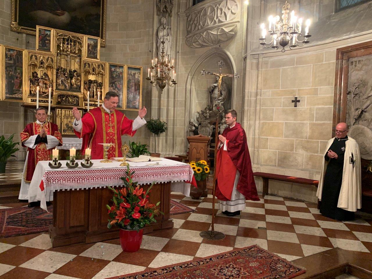Mit einem Pontifikalamt mit S.E. Hochmeister Generalabt P. Frank Bayard OT, sowie der Konzelebration von P. Piotr Rychel als Vertreter der österreichischen Brüderprovinz, wurde am Sonntag, 13. September 2020, in der Deutschordenskirche St. Elisabeth in Wien, diesem Titelfest gedacht. Als Ordinarium Missae gelangte die Missa sexti toni von Johann Ernst Eberlin (1702 – 1762) unter der bewährten Leitung des Hochmeisterlichen Kapellmeisters Thomas Dolezal zur Aufführung. Eberlin stand ab 1726 als Organist und Kapellmeister im Dienste der Salzburger Erzbischöfe und prägte – unmittelbar vor der Ära Mozart - -das Salzburger Musikleben. In seiner Homilie ging der Hochmeister u.a. auf das Kreuz als Erlösungszeichen ein, welches Halt im Leben gibt. Es ist auch ein Zeichen dafür, dass Gott zu den Menschen steht, aber auch für die Rückbindung zum Alten Bund. Für den Deutsche Orden ist das Kreuz Identifikationsobjekt und Zeichen der Hoffnung, aber auch ein Höchstmaß an Solidarisierung und Liebe.