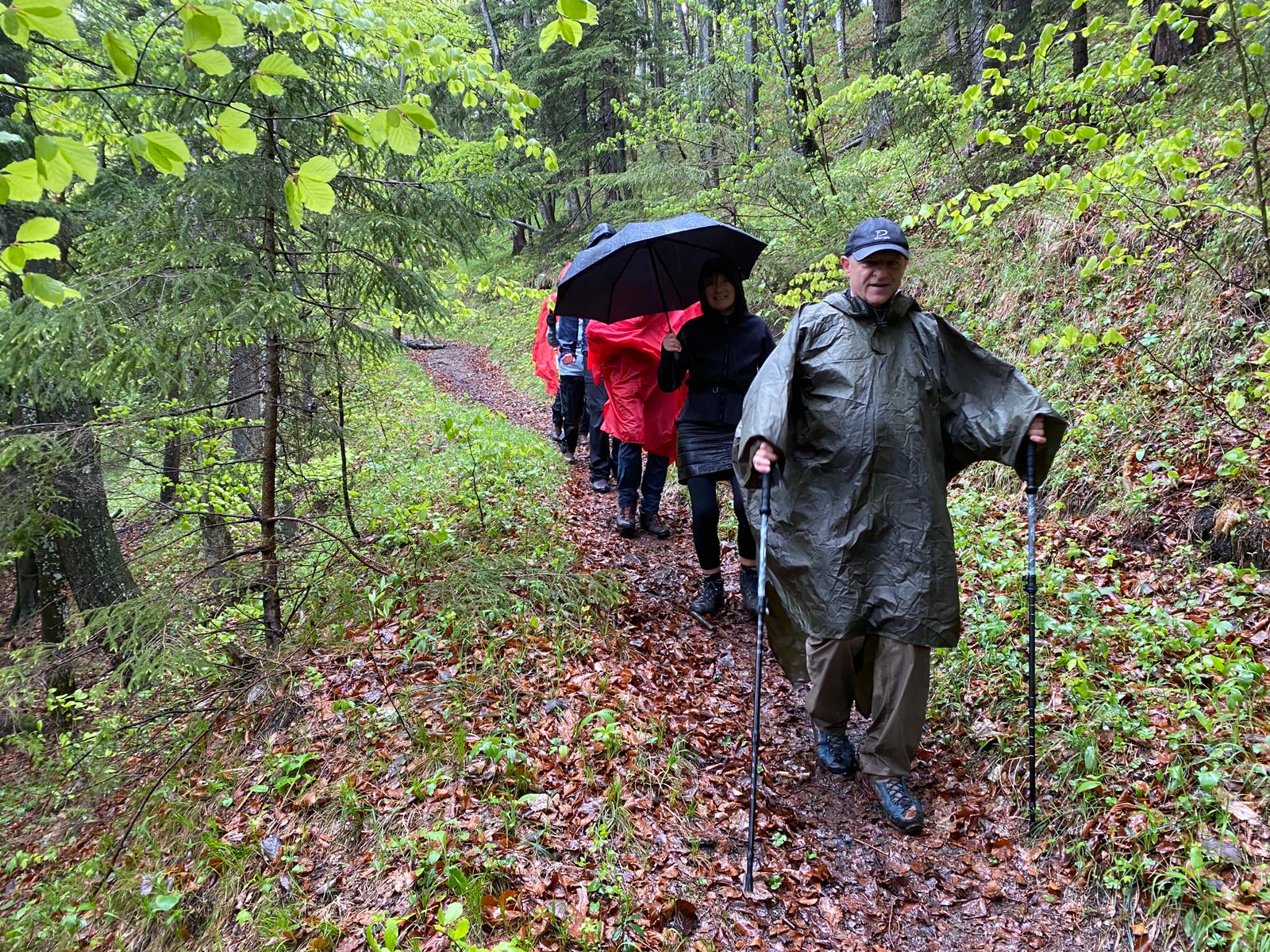 Dieses wurde 1136 gegründet und vom Benediktinerorden bis zu seiner Aufhebung 1782 geführt. Im Jahr 2000 kam es zur Wiederbesiedlung durch die 1982 gegründete Ordensgemeinschaft „Brüder Samariter der Flamme der Liebe des Unbefleckten Herzens Mariens (FLUHM)“. In der Basilika feierten wir Hl. Messe und Vesper, danach Ausklang der Strapazen des ersten Tages, nach Bewältigung von 33 Kilometern, bei einem genußvollen Abendessen. Der nächste Tag war mit 36 Kilometern die längste Etappe und somit die größte Herausforderung. Nach frühmorgendlicher Laudes und Messe in der Basilika Klein-Mariazell führte uns der Weg über Kaumberg zur Araburg, weiter über das Kieneck zum Unterberg-Schutzhaus (1.170 m), ca. 670 Höhenmeter im Anstieg. Nach diesem alpinen Höhepunkt der Wallfahrt ging es stetig bergab über Waldwege ins Tal zu unserm nächsten Nächtigungsort, Rohr im Gebirge. Der Pfingstsonntag begann mit der Laudes in der Pfarrkirche St. Ulrich. Weiter führte uns der Wiener Wallfahrerweg zur Kalten Kuchl in Kleinzell, einer Raststätte die im 15. Jahrhundert entstand. Von dort gelangt man über einsame Gründe und bergige Auf- und Abwärtsstrecken nach St. Aeygd am Neuwald. Eine relativ kurze Etappe von 22 Kilometern, aber für uns sehr herausfordernd, da es Regen in unterschiedlichen Intensitäten den ganzen Tag gab. Umso erbauender war die abschließende Hl. Messe in der Pfarrkirche. Am letzten Tag, dem Pfingstmontag, führte uns der Weg über das Gscheid mit wunderbarem Ausblick auf den Göller, weiter zum Gasthof Wuchtlwirtin mit den weithin bekannten Wuchtl-Variationen mit Vanille oder Schokolade oder auch beidem sowie mit Eierlikör. Nach kurzer, aber genußvoller, Einkehr ging es weiter über den Hubertussee und abschließend dem Sebastianiweg zur Mariazeller Gnadenkirche, 119 Kilometer von Wien-Rodaun nach Mariazell waren geschafft.