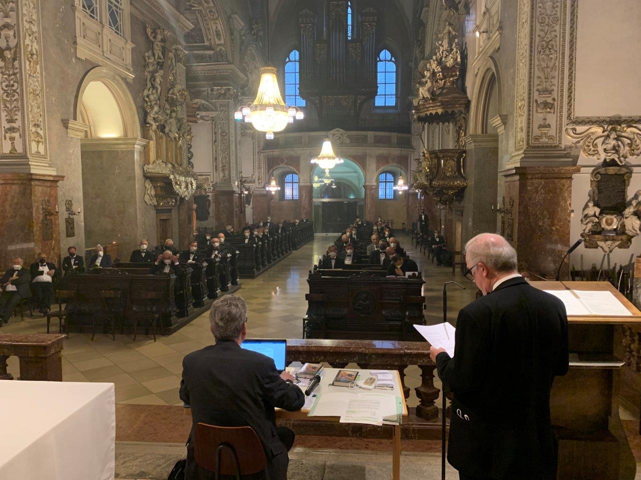 Nach der Hl. Messe wurde der Jahres- und Wahlkonvent ebenfalls in der Franziskanerkirche abgehalten. Nach Begrüßung der Teilnehmer durch Balleimeister Müller, dem gemeinsamen beten des Familiarengebetes und dem Gedenken an die seit April 2019 Verstorbenen Confratres, erfolgten die Berichte von Balleimeister, Balleikanzler, Komture, Balleiökonom und Rechnungsprüfer. Nach Entlastung des Balleiökonomen für die Rechnungsjahre 2019 und 2020 wurde über die am nächsten Tag stattfindende Investitur berichtet und die acht Kandidaten vorgestellt. Danach erfolgte die Präsentation der Spendenprojekt für 2021: 1.) Alten- und Pflegeheim „Haus Suavitas“ – Deutschordens Pflege GmbH, Anschaffung von 50 Stk. Pflegematratzen für die Pflegebetten sowie div. Ergänzungen wie Beschattung und Sitzgelegenheiten im Demenzgarten usw. 2.) Unterstützung des Forschungsprojektes zur Liturgie des Deutschen Ordens am Institut für Liturgiewissenschaft und Sakramentaltheologie der Katholischen Privatuniversität Linz, Vorstand Univ. Prof. Dr. Ewald Volgger OT. 3.) Unterstützung von Renovierungsarbeiten in der ehemaligen Deutschordenskirche in Graz, der Leechkirche. Nach einem Resümee des Balleimeisters über die abgelaufene Funktionsperiode und dem Dank an alle Mitglieder der Balleileitung für ihr aktives Mitwirken in dieser Zeit, erfolgte die Wahl der neuen Balleileitung. Als Balleimeister wurde Cfr. Rudolf Müller zum zweiten Mal in Folge wiedergewählt, zu Balleiräte wurden die Cfrs. Christoph Heimerl, Christian Herrlich, Robert Klier, Kurt Retter, Franz Schwarzl, Ulrich Voit und Helmut Wohnout gewählt. Der neue und alte Balleimeister bedankt sich für das entgegengebrachte Vertrauen und freut sich auf eine gute und fruchtbare Zusammenarbeit mit den neuen Vorstandsmitgliedern in den kommenden drei Jahren. Zum Abschluss berichtete noch Hochmeister Frank über Aktuelles aus der Ordensgemeinschaft und ging dabei auch auf mögliche zukünftige Entwicklungen ein. Mit dem gemeinsamen Absingen des Ordensliedes „Ultima in mortis hora“ wurde dieser Konvent beendet.