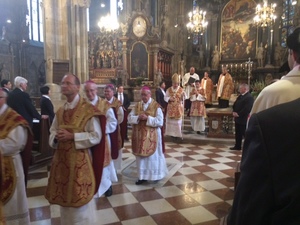 Wie jedes Jahr, so auch heuer, nahmen die Familiaren der Ballei Österreich sehr zahlreich an den Fronleichnamsfeierlichkeiten in Wien teil, unterstütz von einigen Familiaren der Komturei „An Tauber, Neckar und Bodensee“, die unter Ihren Komtur Hans Joachim Staudenmaier eine Wienreise unternommen hatten. Um 08.30 begann das Pontifikalamt im Dom zu St. Stephan unter dem Hauptzelebranten Kardinal Dr. Christoph Schönborn. Hochmeister Dr. Bruno Platter war gemeinsam mit dem Erzbischof von Lahore, Pakistan, Sebastian Shaw, Ko-Zelebrant.